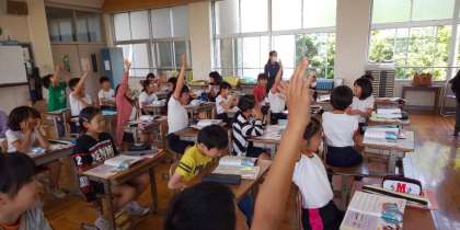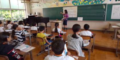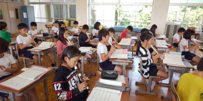 「茶色の小びん」の歌詞の中に飲める物を色々入れて、歌いました。その後、リコーダーで演奏しています。