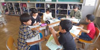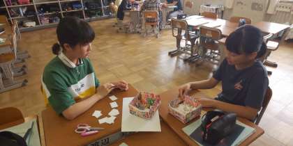 修学旅行に備え、グループで最終確認です。この時間はレクリエーションの準備をしています。