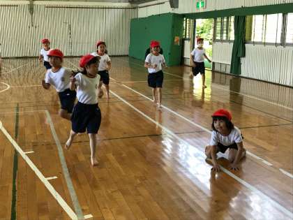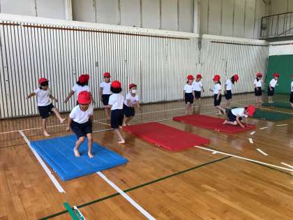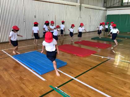 体育で立ち幅跳びの練習をしています。マットから飛び出してしまいそうなくらいジャンプしています。