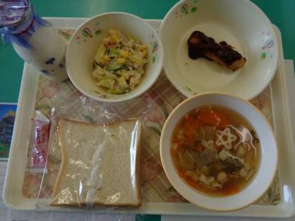 今日の給食は、スライスパン、牛乳、星型マカロニスープ、ソーセージのデミグラスソースかけ、コーンサラダ、いちごジャムです。