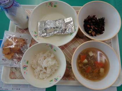 今日の給食は、麦ご飯、牛乳、けんちん汁、鯖の銀紙焼き、ひじき炒め、きらず揚げです。