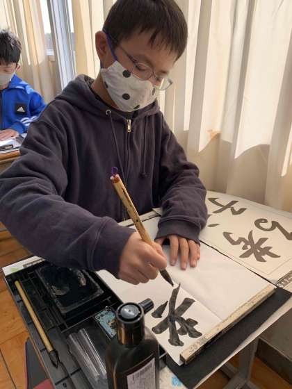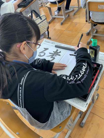 5年生の書写(毛筆)で「考える子」を練習しています。「行の中心や字間・行間のとり方に気を付けて配列を整えよう」をめあてに掲げて取り組みました。上下にくる「考え」「る子」それぞれの位置関係や左右に並ぶ「考」と「る」、「え」と「子」の位置関係を見ながら、文字の大きさに気を付けながら書いていました。また、ひらがなと漢字の両方が出てくるので、漢字は、四角をイメージして、その四角の中に大きめに、ひらがなは、丸をイメージして、その丸の中に、漢字と比べると少し小さめに書くということも意識しました。これまでのまとめとして丁寧に、整った文字が書けるとよいですね。