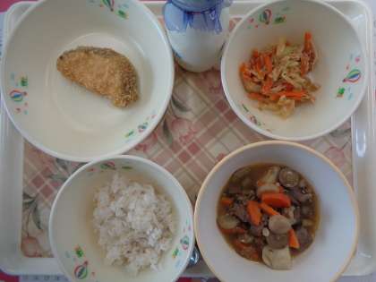 今日の給食は、麦ご飯、牛乳、芋煮、米粉のほきフライ、もやしとキャベツのピリ辛和えです。