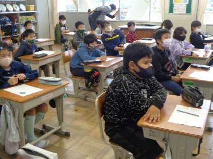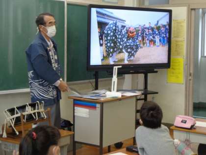 3年生は、総合的な学習の時間に、古場地区の八木さんをお招きして、お祭りについてのお話をしていただきました。