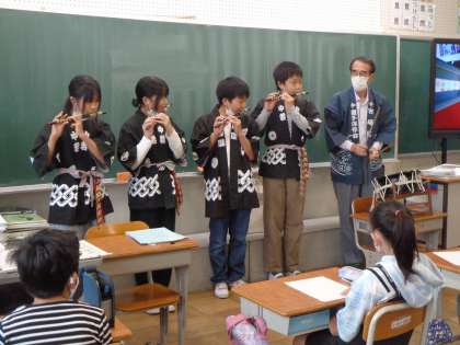 今日は、授業の始めに6年生の囃子保存会会員の4名が、実際に笛の演奏をしてくれました。