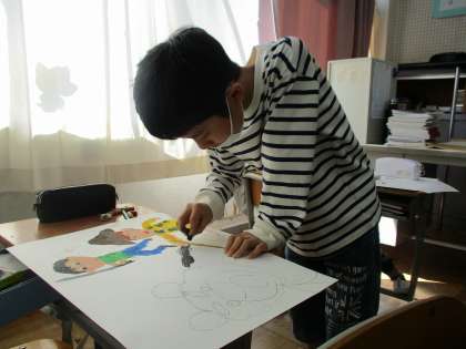 子どもたちにとって、画用紙いっぱいに大きく描くということはなかなか難しいことですが、先生のアドバイスを受けながらしっかり描く姿が見られました。