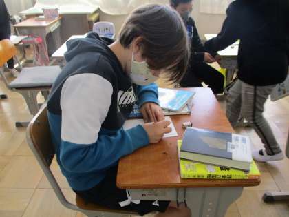 5年生の教室では、子どもたちがペア学年の3年生に宛ててハガキを書いていました。