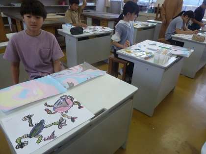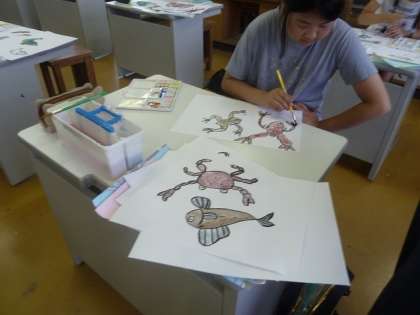 TOTO作品展に出品する作品に取りかかっていました。マーブリングで仕上げた台紙に描いた生き物を載せていきます。動きのある生き物の様子を生き生きと表現していました。