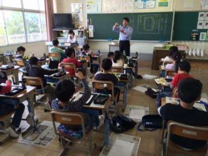 初めての毛筆の授業にみんなワクワク!準備の仕方、片付けの仕方などの約束を教頭先生から教えていただきました。