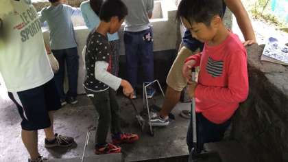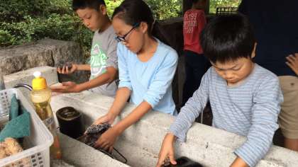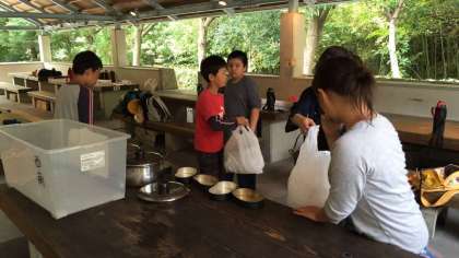 食事をおいしくいただいた後は、みんなで後片付けです。使う前よりきれいにしようと協力してやっています。