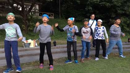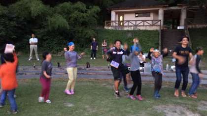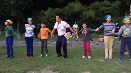 みんなで「ジンギスカン」と「キャンプだホイ」を元気いっぱいに踊りました。先生たちも参加して盛り上がってきました。