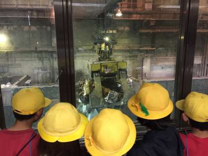 実際にごみが運び込まれる様子や、ごみピットでごみを細かくする様子も見ることができました。目の前で動くクレーンに大興奮!ルールやマナーもしっかり守り、たくさんの学びがある校外学習になりました。今後の生活で、ごみの始末の仕方をきちんと意識していきます。