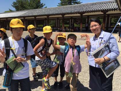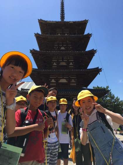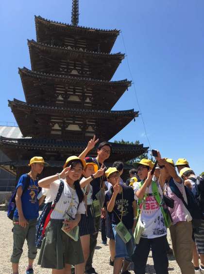 五重の塔の前で。たくさんの修学旅行生がいます。