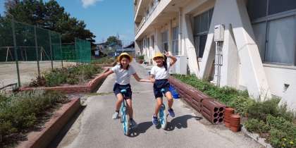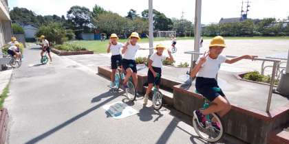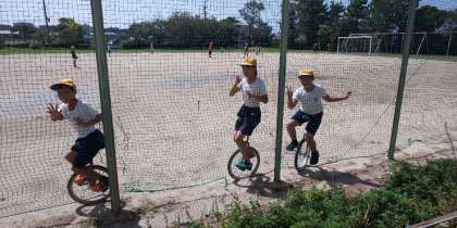 大放課に、5年生が自主的に一輪車の練習をしています。
