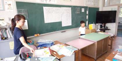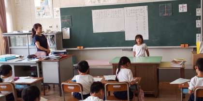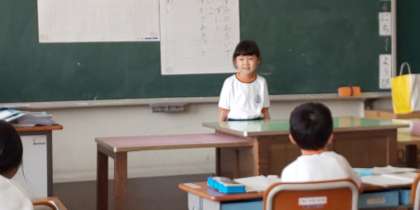 1年生が夏休みの思い出を発表をしています。メモを見ないでしっかり話すことができました。