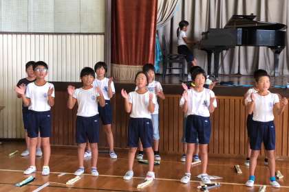 5時間目に4年生は体育館で小中音楽会の練習をしました。少し緊張している様子もありましたが、徐々に4年生らしい元気さが出てきました。来週月曜日には、朝会時に全校児童の前でリハーサルです。