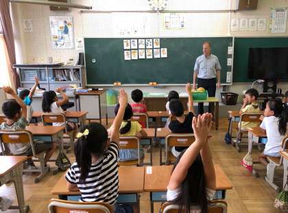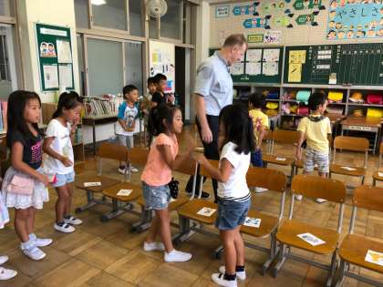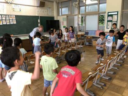 ALTのマーク先生と、英語であいさつ、自分の気持ち、動物の名前を言いました。アクティビティでは、歩き回ってみんなとあいさつをしたり、動物の名前を使って、ゲームをしたりしました。どの子も進んで話し、楽しく英語を学びました。