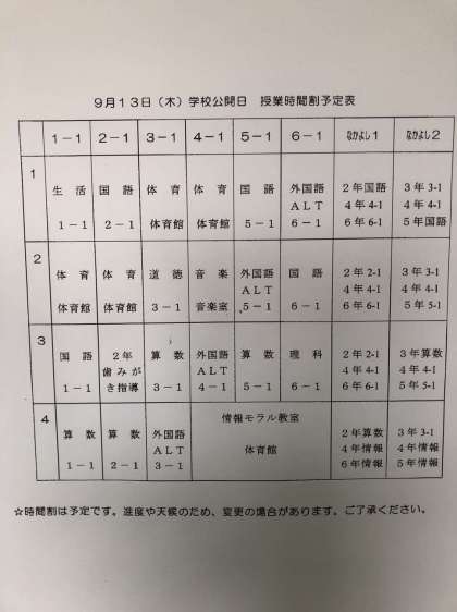 本日、午前中は学校公開日です。たくさんの方のご参観をお待ちしています。駐車場は運動場の芝生部分をご利用ください。よろしくお願いします。