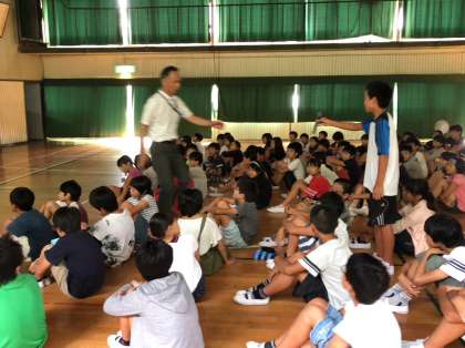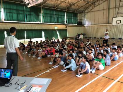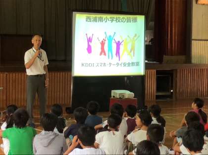 4時間目、4〜6年生はKDDIスマホ・ケータイ安全教室の岩田さんに講師として来ていただき、情報モラルの授業です。