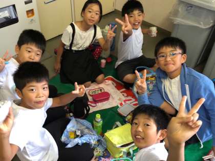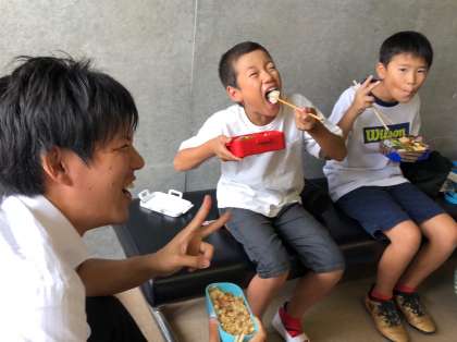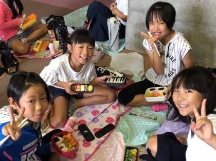 あいにくの雨のため、ロビー内でのお弁当の時間です。12時30分に開会式の後、全体の一番最初の発表です。