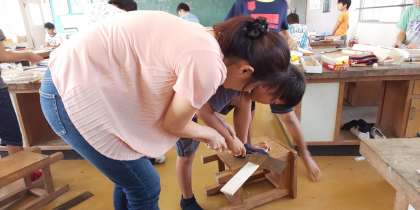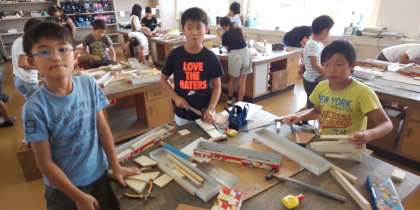ノコギリやトンカチを使って、思い思いの作品を仕上げています。