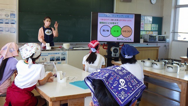 粉ふきいもを作るエコクッキングをしました。ジャガイモの切り方、水の量、使う鍋、炎の大きさなどを工夫して二酸化炭素の排出量を減らす調理法を考えて取り組みました。