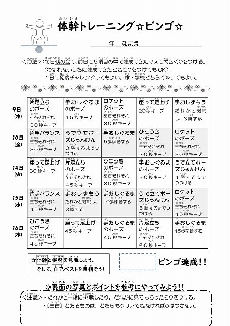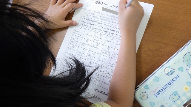 体幹トレーニングキャンペーンが始まりました。用紙が配られると早速やってみようとしていました。