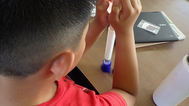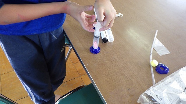 注射器の中に閉じ込めた空気や水を圧し縮めることができるか実験をしていました。注射器の中に入れたスポンジの大きさの違い、手応えから理解していました。
