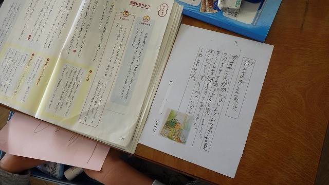アーノルド・ノーベルの「がまくんとかえるくん」の学習のまとめとして、登場人物に手紙を書いていました。このシリーズは、思いやりあふれた作品です。他の作品も読んでみましょう。