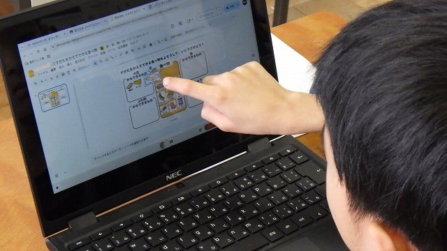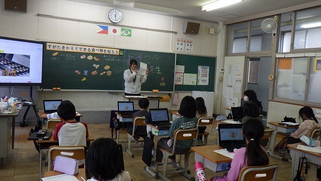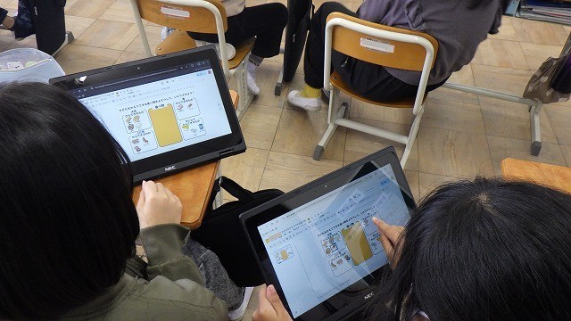 校長室 栄養教諭の先生から「姿を変えてできる食べ物を知ろう」で授業をしていただきました。タブレット端末を使って、自分で食品を「大豆からできている」「魚から」「豚肉から」「牛乳から」と分け、その後、隣の人と意見交換しました。「みそ」や「ちくわ」、「チーズ」などが難しかったようでした。加工食品の製造過程の動画を見て理解を深め、食品への興味を高めていました。