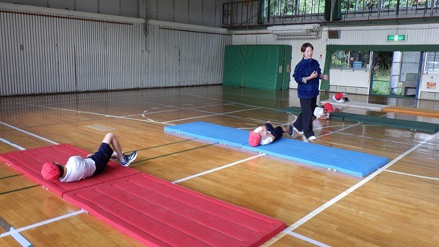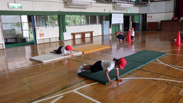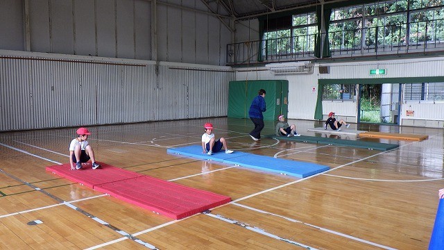 背中を下に両手両足をつけて後ろ向きに進んだり、丸太のように転がったり、マットの幅で手と足をつけて横に進んだり等、マットを使った運動に親しんでいました。
