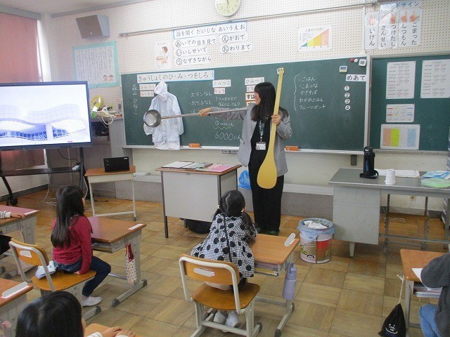 給食の調理員さんと給食当番の白衣との違いや実際につかっている道具を触ったりすることで、給食を作っている人の存在や願いを知って給食を食べようという気持ちを育みました。