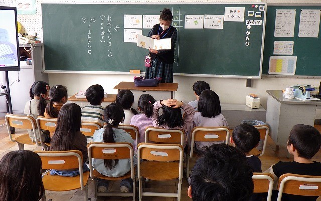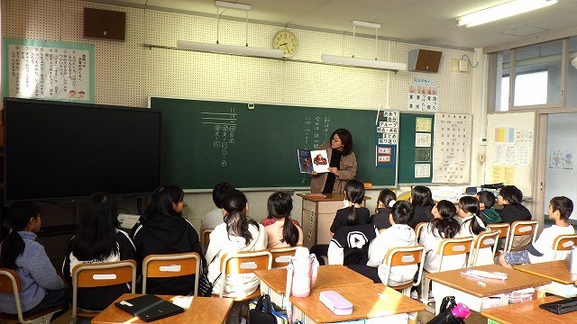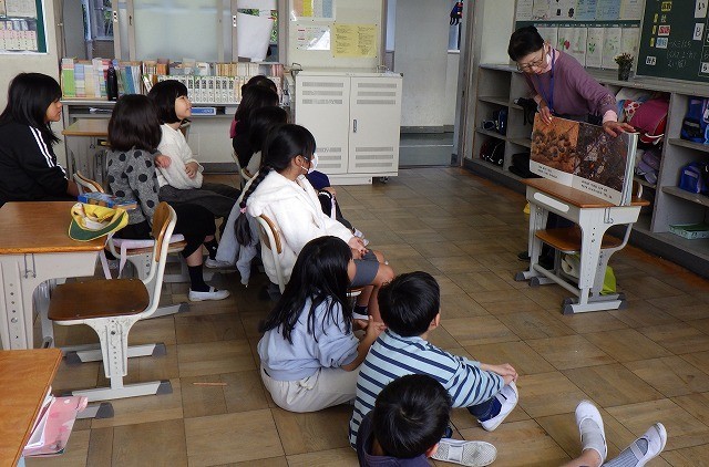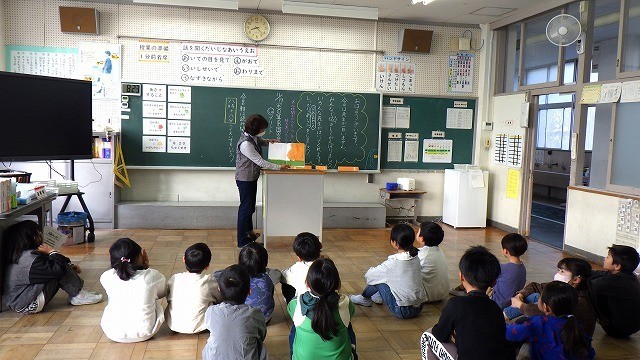 1年生には「ぱくぱくはんぶん」「さつまいももち やけたかな」「こねこねねこの ねこうどん」、2年生には「ぼくはあるいた まっすぐまっすぐ」「あめだまをたべたライオン」「カメレオンのカメレくん」、3年生には「ダンゴムシみつけたよ」「ひとつめのくに」、4年生には「しごとをなくしたサンタさん」「ルドルフ赤い鼻のトナカイ」を読み聞かせしていただきました。「ひとつめのくに」は、多数派の中の少数者を化け物扱いするのはどうなのか、多数決は民主主義なのか考えさせてくれる話でした。「ルドルフ」は赤鼻のトナカイの歌の元になった話だそうです。ありがとうございました。