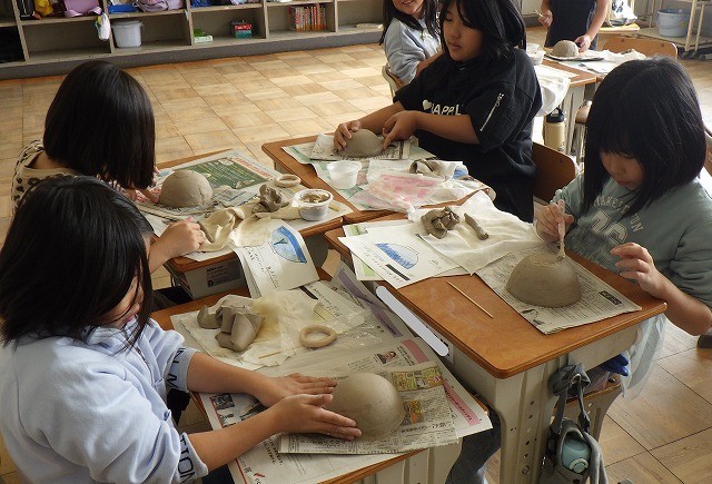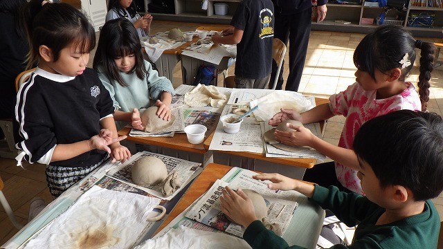 陶芸家の方の指導を受け、お茶碗を作ります。粘土をスライスし、型にかぶせて押し当て、竹串で余分な粘土を切り取ります。切った部分を整え、高台をつけ、模様をつけていきます。「お父さんにプレゼントしたい」と優しい言葉が聞かれました。できあがったお茶碗でご飯を食べるのが楽しみです。講師の先生、ありがとうございました。