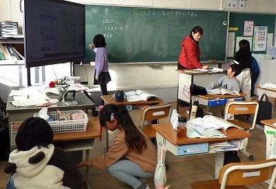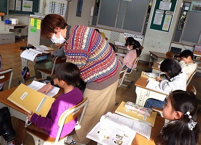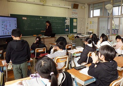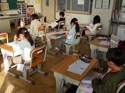 テストの返却、間違いの多かった箇所について解説をしていました。「見て見て」何人かの児童から声をかけられました。学習成果に満足していました。