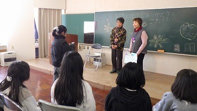 1年生には「おばけかみしばい」「やつばけずきん」、2年生には「春になったらあけてください」「ぶた たぬき きつね ねこ」、3年生には「しもんのぎもん」「おおかみだんなとろば」「てんとうむしとんだ」「しぜんとかがくのはっけん366クイズ」、4年生には「あらまっ!」「みつけようはる」を読み聞かせしていただきました。お話の世界に引き込まれ、自分の指紋を見つめている人がいました。今日は、冷たい風が吹いていますが、梅の花が咲きほころび、つくしも顔を出してすっかり春です。春を見つけたくなりました。