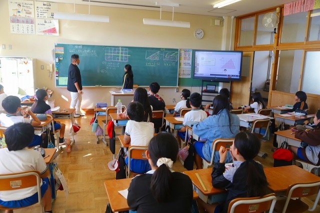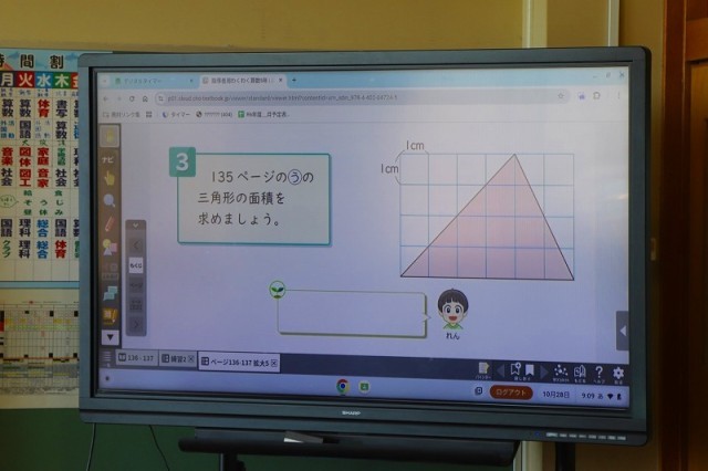 ます目の中にある三角形 みんなの前で、ますを上手に使って面積を求める考え方を説明していました。