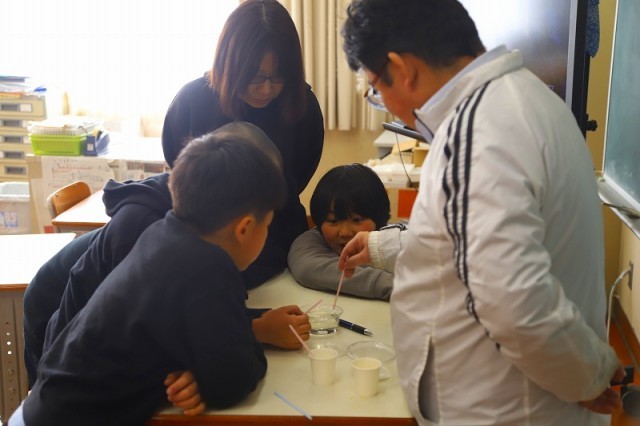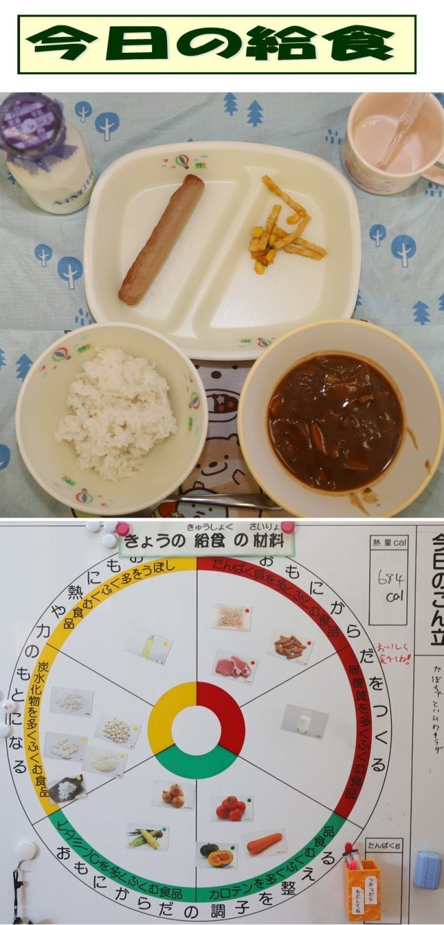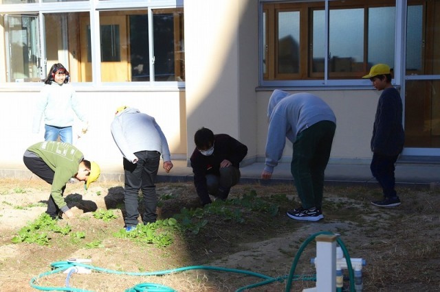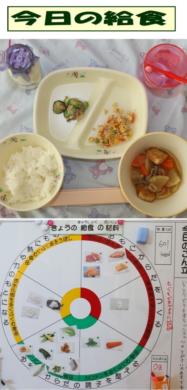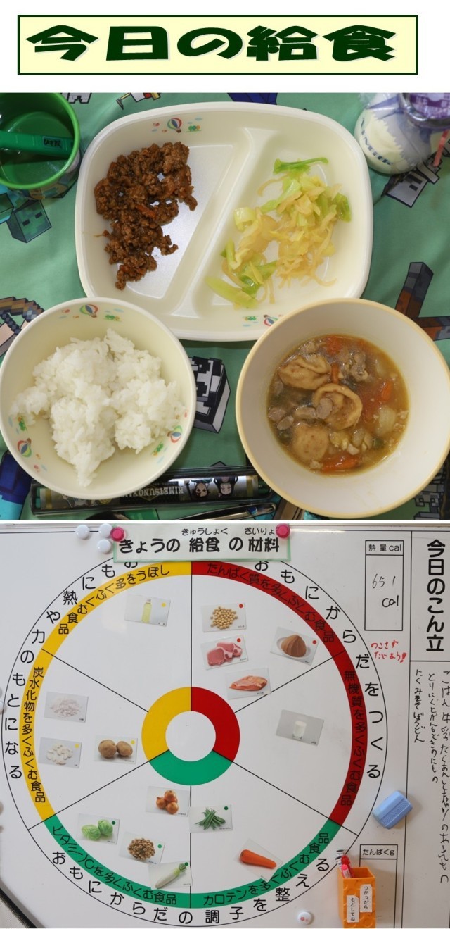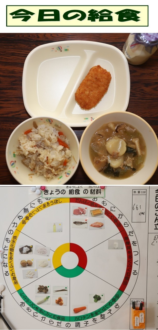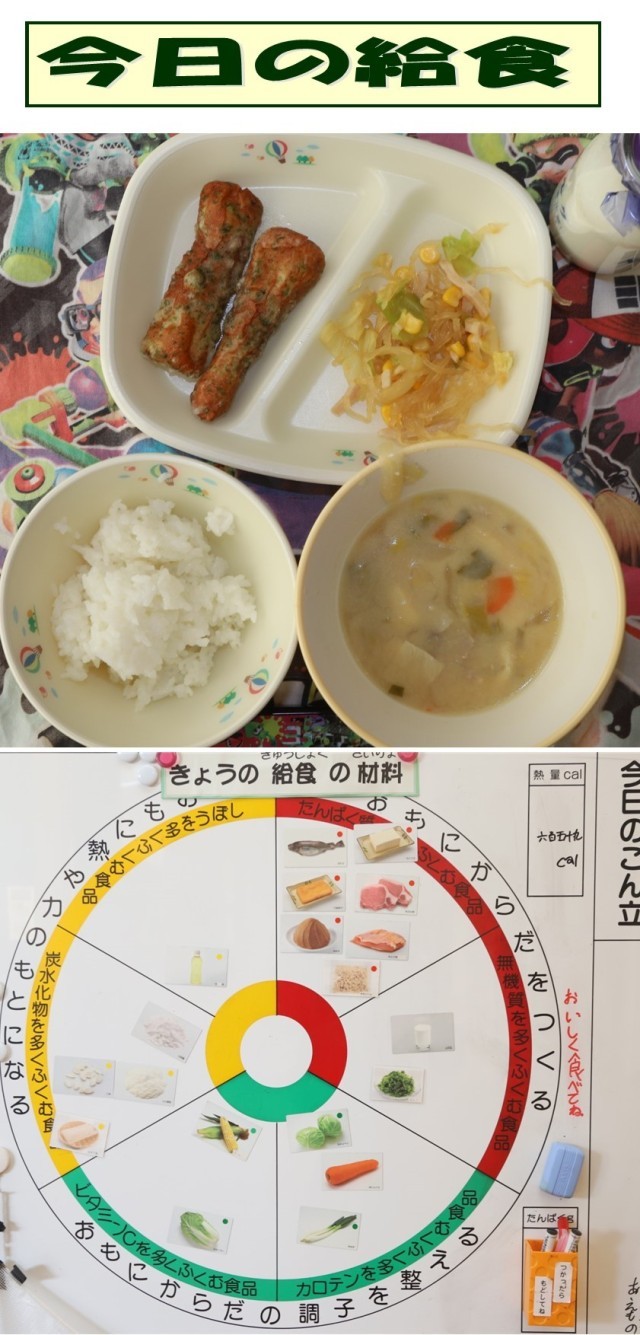 がんもどきとは、○○をつぶして、野菜 を混 ぜて、油 で揚 げた食 べ物 です。今日 は、とり肉 やじゃがいも、にんじんなどの具材 と一緒 に煮込 んだ煮物 にしました。出汁 を吸 ったがんもどきを味 わって食 べましょう。(給食委員の昼の放送より)