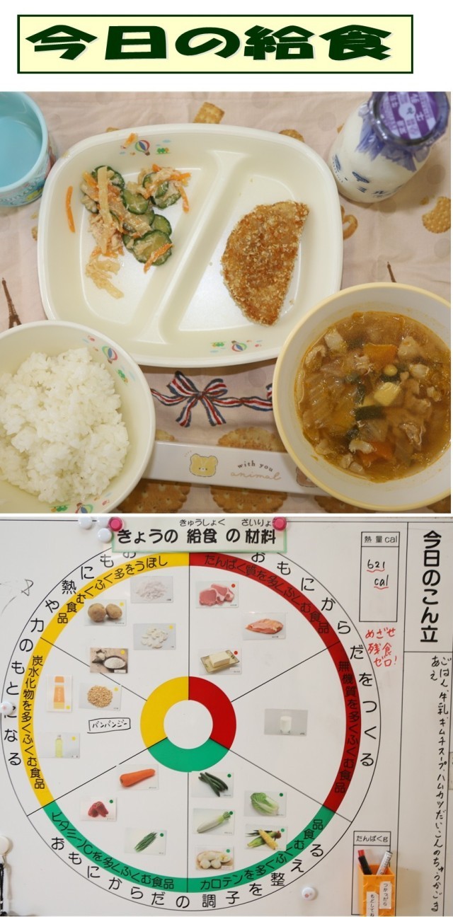 キムチは、大根 や白菜 、きゅうりなどの野菜を塩で漬け込み、○○ やにんにくなどの食材を合わせた調味料を混ぜて作ります。今日は、キムチをスープに入 れ、中華風に仕上げました。キムチの風味を感じながら食べましょう。(給食委員の昼の放送より)