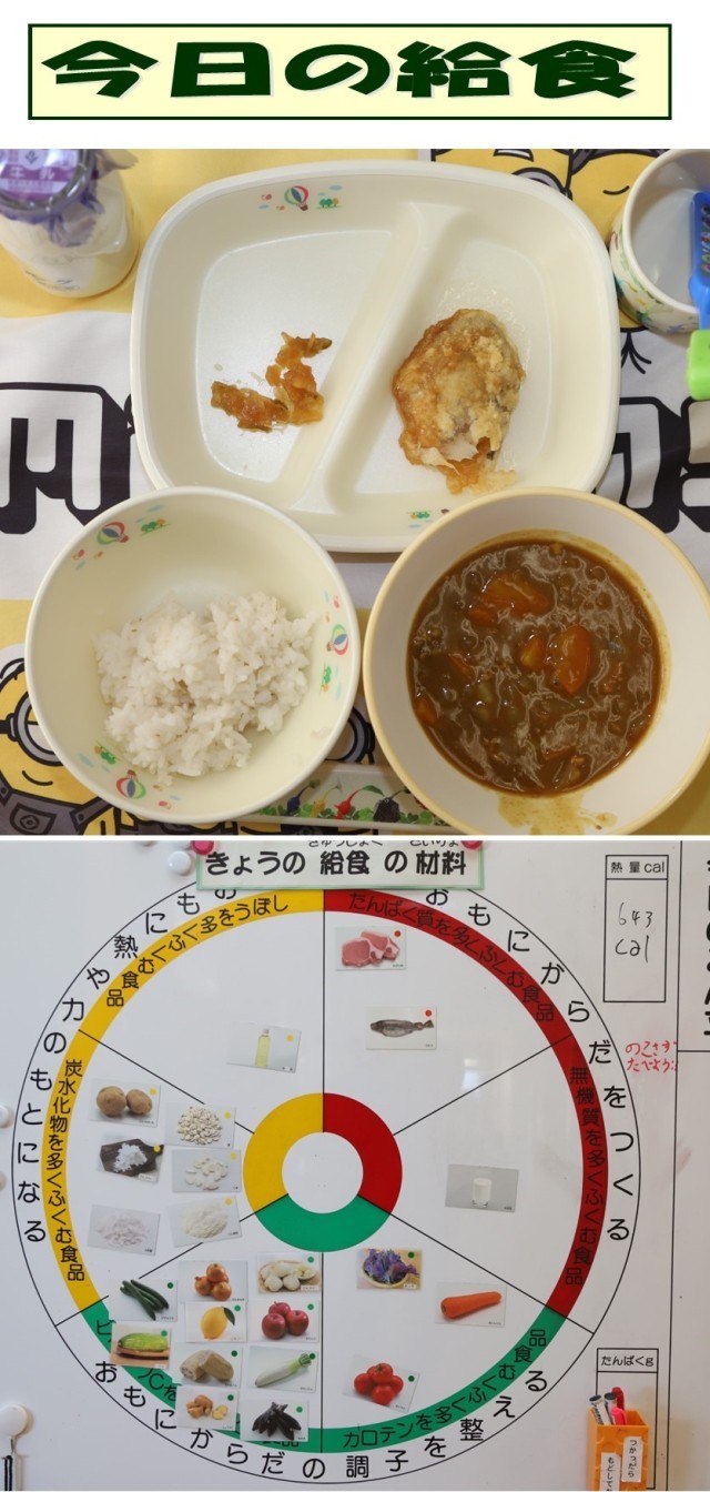 給食のカレーライスには、○○をを入 れることで、甘 みが加 わります。カレーライスの隠し味には、りんご、はちみつやチョコレート、コーヒーなどを使うこともあります。お家のカレーライスにはどんな隠し味が使われているか、自分だったらどんな隠し味を使いたいか考えながら食べてみましょう。(給食委員の昼の放送より)