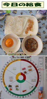 今日は、小中学校の親子丼をつくるために約200キログラムのたまごを使 いました。味わって食べましょう。(給食委員の昼の放送より)