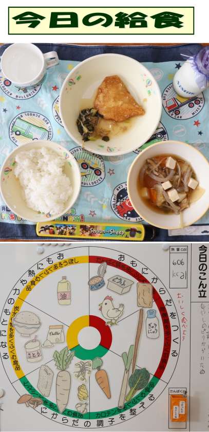 今日の揚げ物のたれは、○○、○○、しょうゆ、砂糖、酒、みりん、でんぷんを使って、甘みのあるたれに仕上げています。たれをかけることで、鶏肉のパサパサした食感を和らげるようにし、食べやすくしました。(給食委員の昼の放送より)