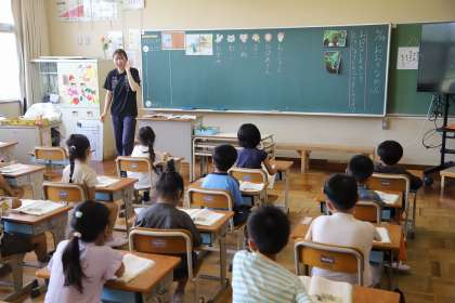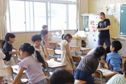 かけ声にあわせて、大きなかぶを抜くまねをしています。