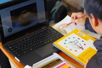 9月14日(水)おおぞら組は村上先生の授業で、巨大シャボン玉づくりに挑戦しました。大きなたらいに洗剤等を配合した液を入れ、ハンガーを変形した輪っかをひたしてシャボン玉をつくります。ビョーンと伸びてはくれるのですが、なかなか玉にはなりませんでした。