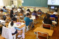 図画,書写コンクールの表彰の後,6年生が「なわとびチャレンジカード」の技のデモンストレーションを行いました。「交差二重とび」や「後ろハヤブサとび」などの難しい技も披露しました。