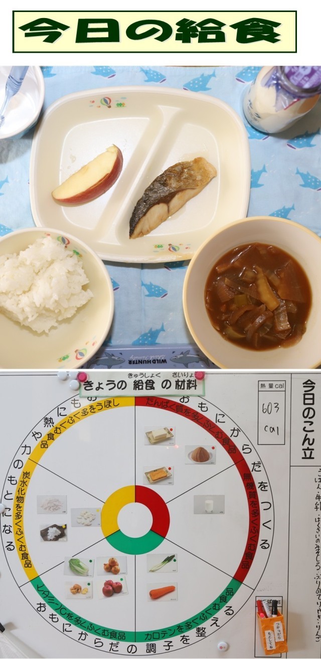 ○○は、筋肉 や体 をつくるもとになる栄養素 です。赤・緑・黄 の食べ物のグループでは赤色の食べ物に多く含 まれます。今日 は、ささみ に じゃがいもと米粉で作った衣を付けています。味わって食 べましょう。(給食委員の昼の放送より)