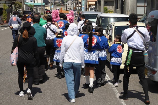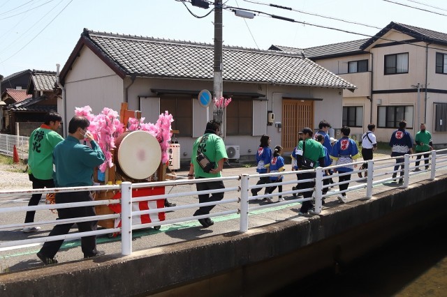 区長さんの家の前でお囃子を行い、2手に分かれて巡回しました。