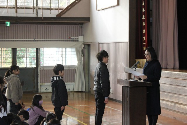 学校では、3学期の始業式を行い、式の中で子どもたちには「目標をたててがんばってほしい」と伝えました。馬の赤ちゃんが生まれて1時間ほどで自分の足で立つことを例に挙げ、失敗しないかっこよさではなく、失敗してもあきらめないかっこよさをめざしてほしいと話しました。式の後、書写コンクールの表彰も行いました。