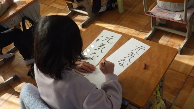 3学期に書き初め大会があります。今日は1~3年生が書き初めの練習をしていました。1・2年生はフェルトペンで、それぞれ「お正月」「元気な子」と書きます。字の大きさや形に気を付けて、真剣に練習をしていました。3年生からは習字で書きます。「正月」の文字を止め・ハネ・はらいに気を付けながら繰り返し練習していました。4年生以上は文字を自分で考えて書きます。どんな文字を書くか楽しみです。