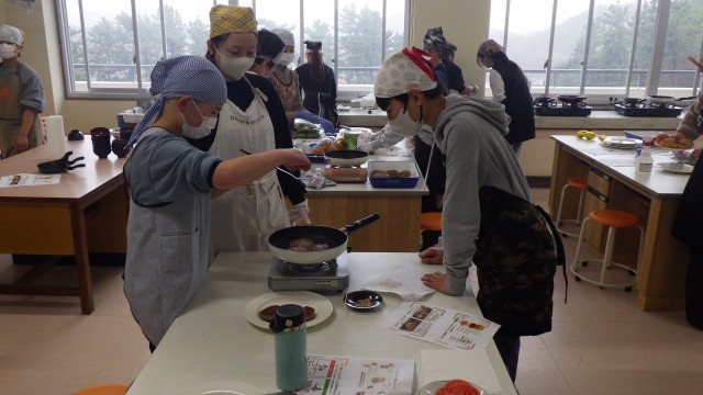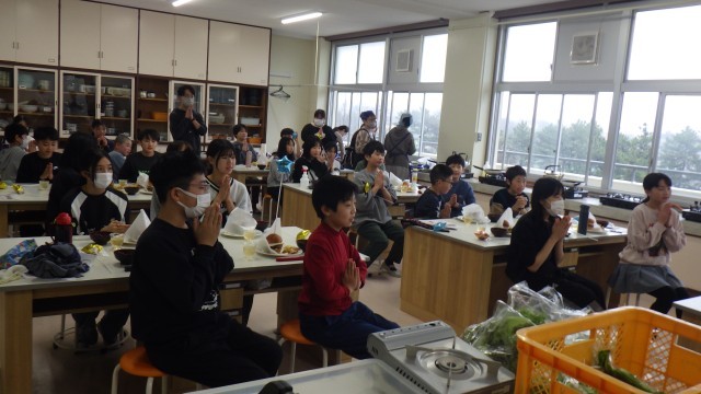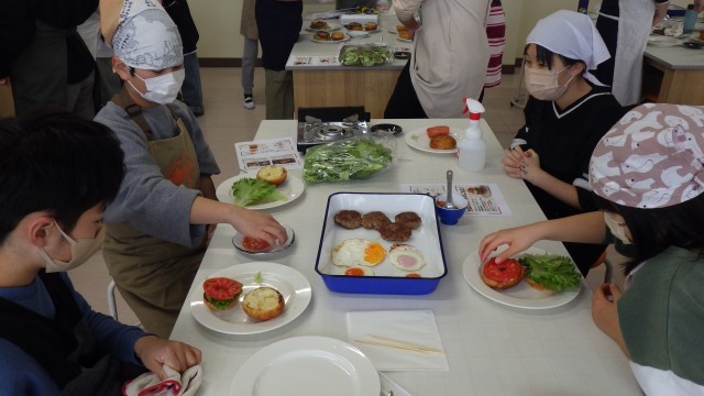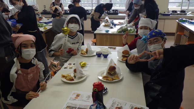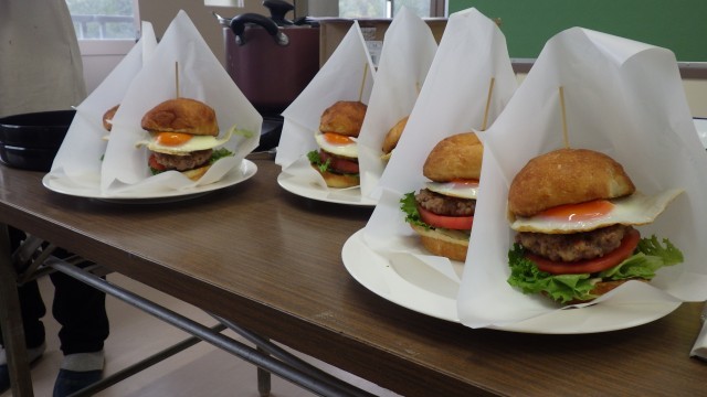 6年生の卒業を記念して、「小鈴谷スペシャル『究極のハンバーガー』を作ろう」というテーマで、調理実習を行いました。小鈴谷プロジェクトの方々のご協力で、小鈴谷周辺の地域から、卵、豚のひき肉、白菜、トマト、レタス、ジャガイモ、大根の寄付をいただきました。デイリーファームの方から作り方を教えていただいたあと、さっそく調理に取りかかりました。保護者ボランティアの方に手伝っていただきながら、大きなハンバーガーができあがりました。みんな満面の笑みで、ほおばっていました。地域の方々のご協力に心から感謝申し上げます。